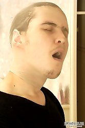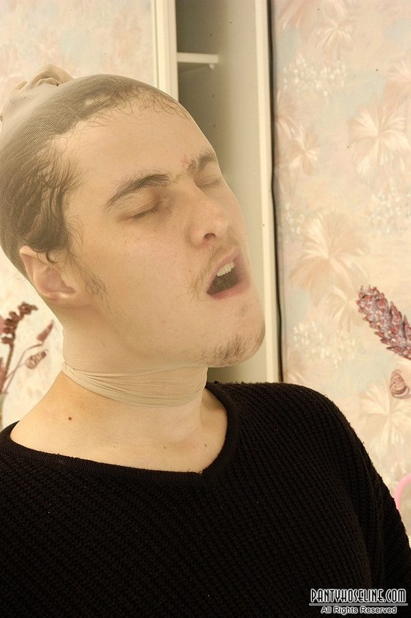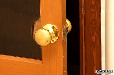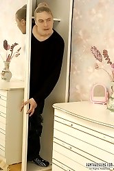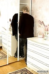 Horny intruder with nylons on his face spying upon raunchy gal posing naked