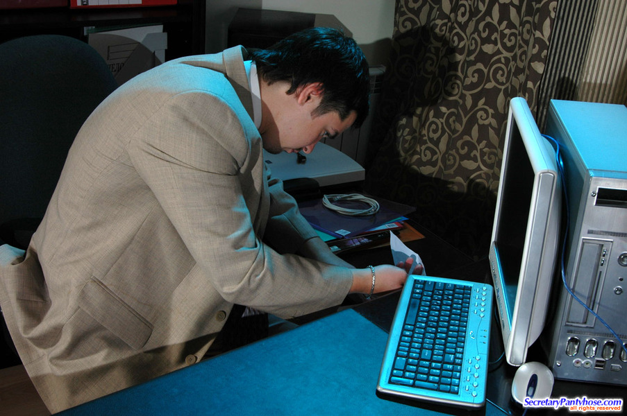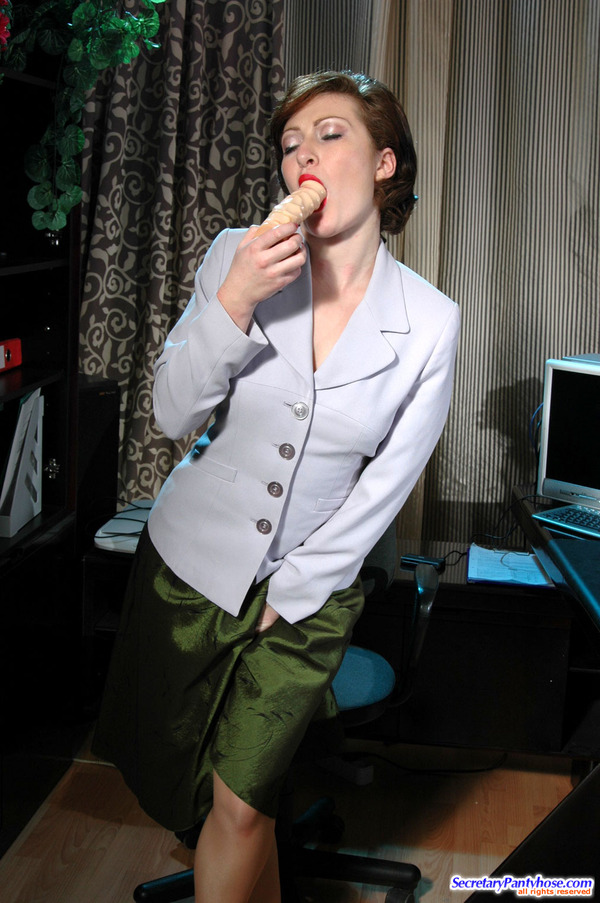 Sultry secretary in soft pantyhose playing with dildo before mighty dicking